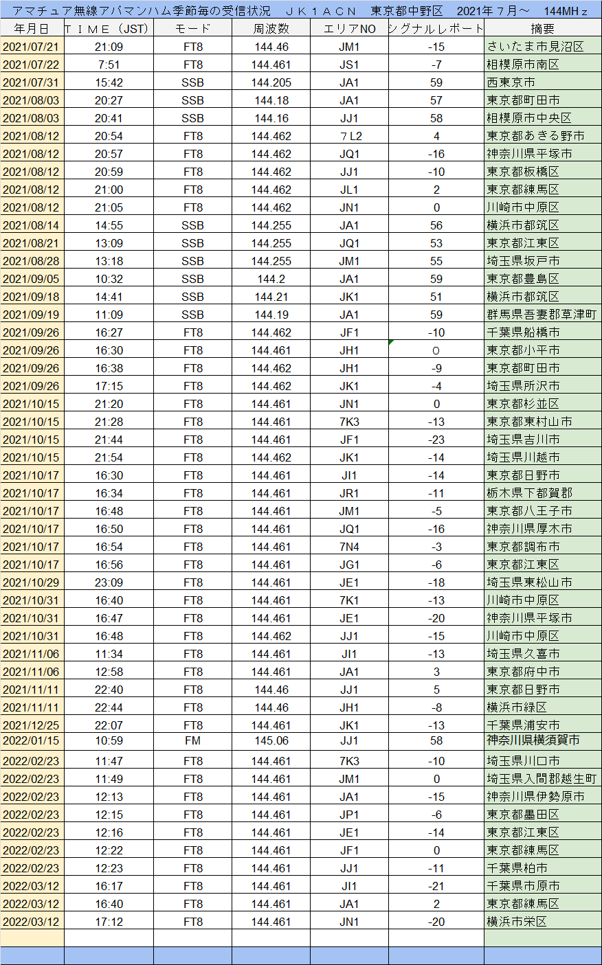 144MHzで今回のQSOデータによると、年の内7月から12月を超えて3月までのデータでは、SSBもFT8なども東京都中野区より1エリア内で東京だけではなく関東地方での交信が可能の様でしたが、その他の地域エリアはカバー出来ません様でした。東京、神奈川県、埼玉県、群馬県、千葉県、栃木県のアマチュア無線局と交信が出来ました。 シグナルレポートはFT8はパソコンのデータそのままでしたが、SSBとFMは無線機のメーターによるというよりも自分で耳で聞いた受信感度による方法のものが主です。144MHzでのSSB、FT8だと主に関東地方エリア対応の様でした。